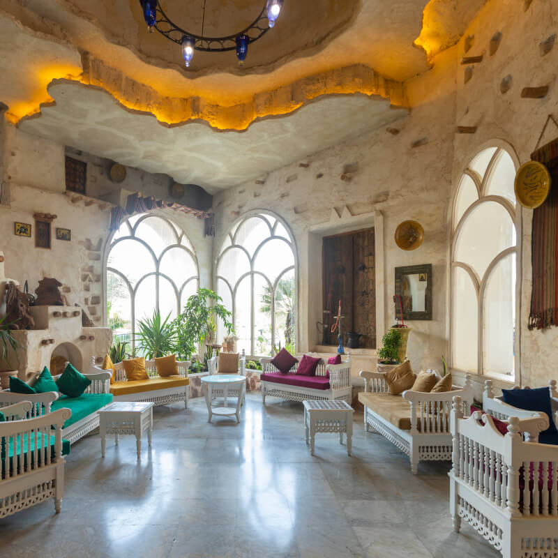 Les repas sont servis sous forme de buffet au restaurant principal « Mouja », où se mêlent spécialités locales et saveurs internationales, accompagnés de boissons locales, avec ou sans alcool.
